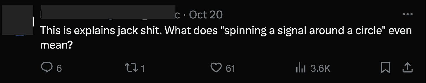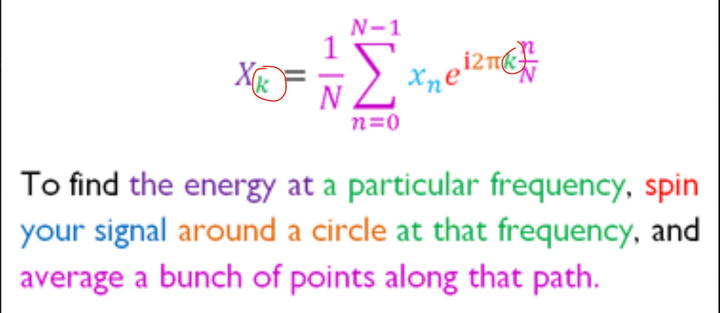 8. “To find the energy at a particular frequency, spin your signal around a circle at THAT frequency, and average a bunch of points along that path.”