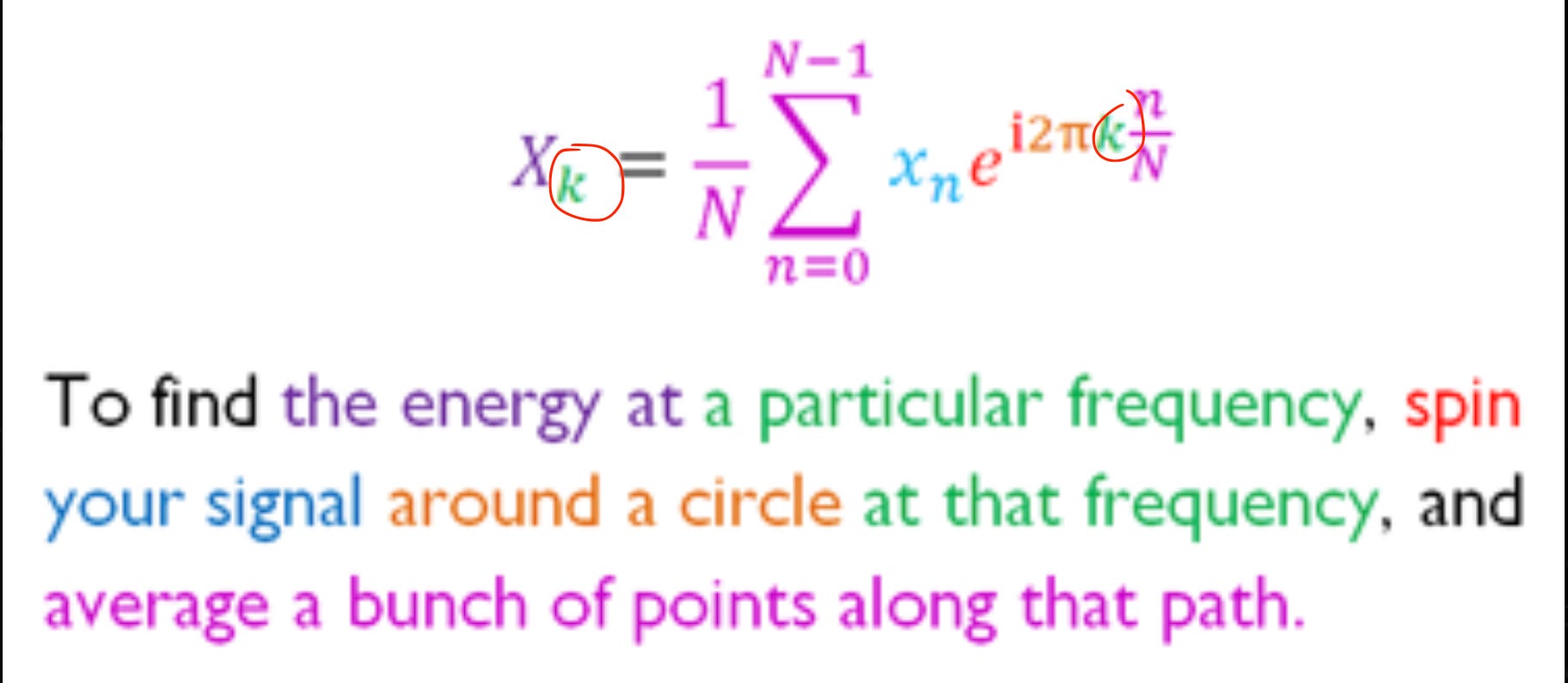 7. “To find the energy at a particular frequency, spin your signal around a circle at THAT frequency”