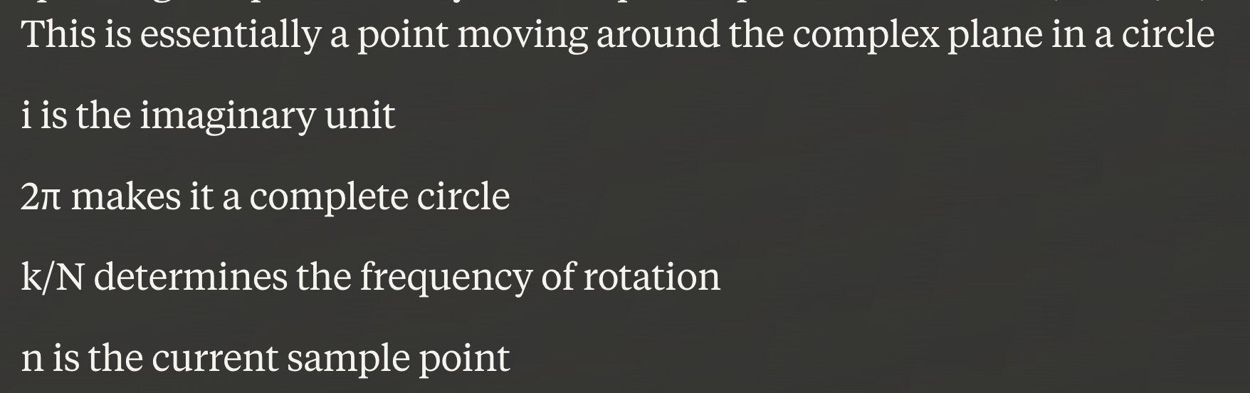 How do we do this? We multiply each signal point (blue x) with a “magic formula” and get a point on a circle. We do this for many different signals (different x_n, because the n just starts at 0 and ends at N - 1), so we essentially achieve some sense of movement (spinning) around a circle.